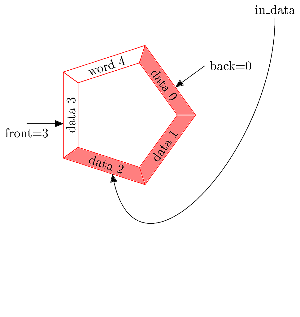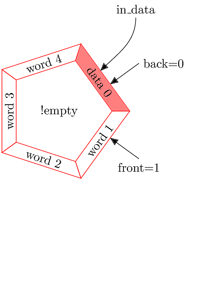 As an example, consider a buffer with DEPTH=5. Initially, the buffer is empty with front=back=0.