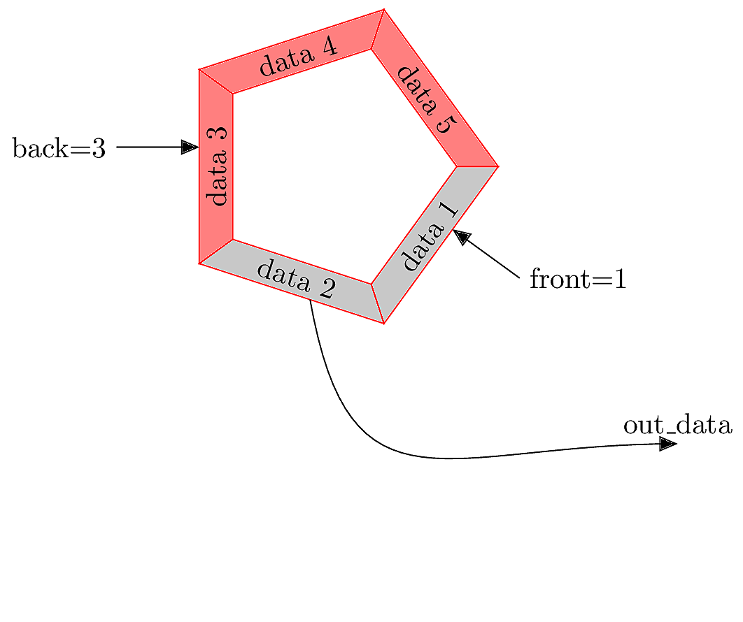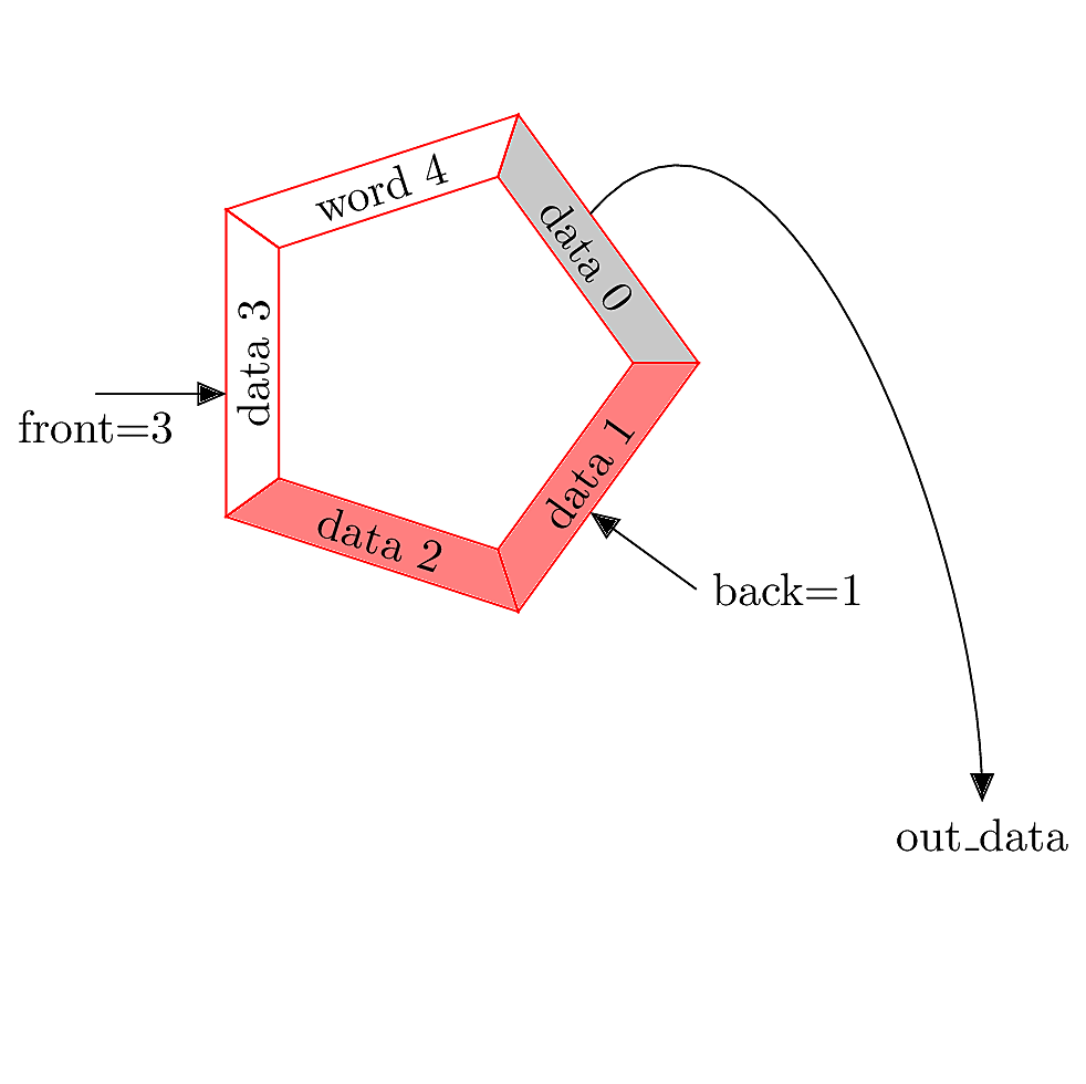 When data is pulled out from the FIFO, it comes from the back, since that is where the “first” (i.e. oldest) data is located. The data item is written to the output interface, and back is incremented. The old data is still present at array position 0, but is now considered stale (indicated by the gray color).