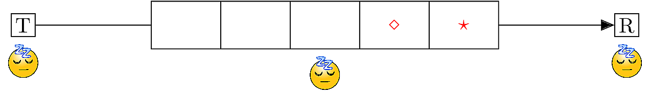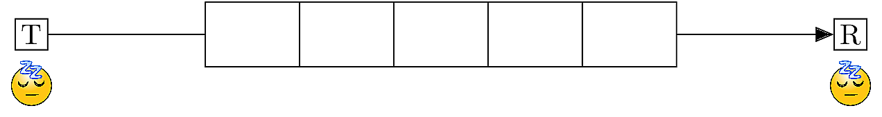 The queue brokers this transaction by providing a small amount of memory. T can write into the queue at any time, and R can read from the queue at any time.
