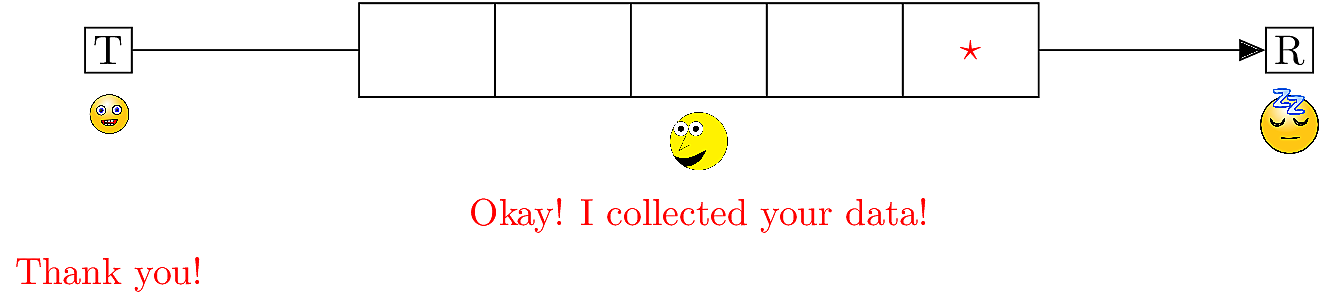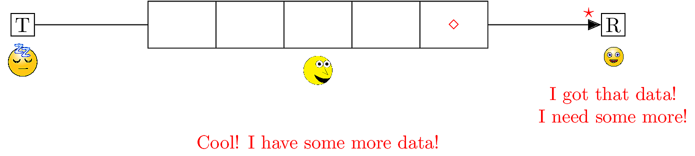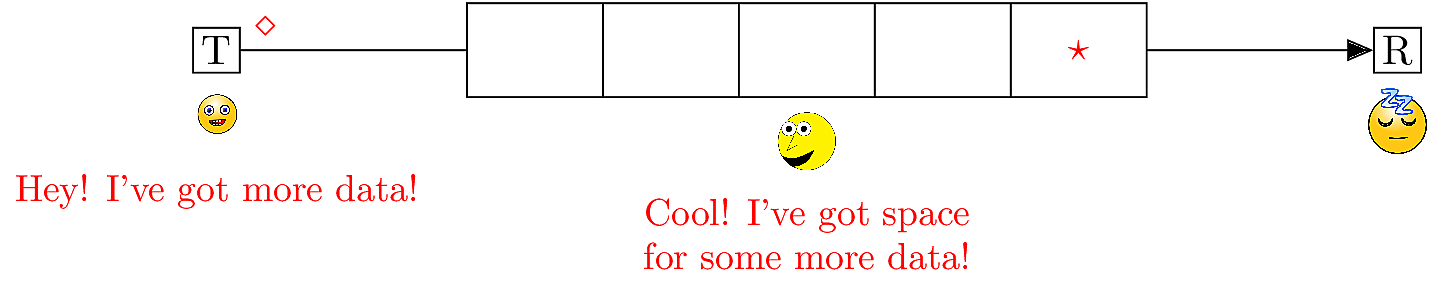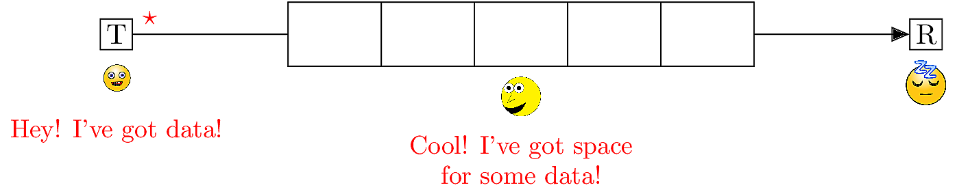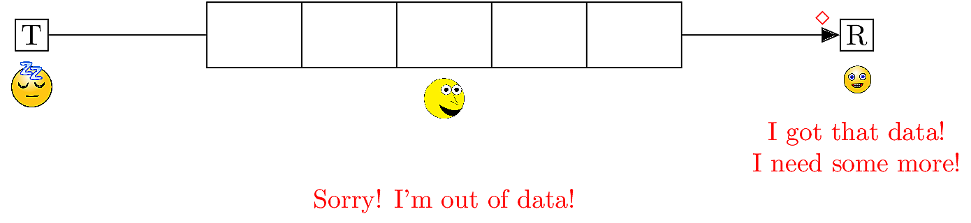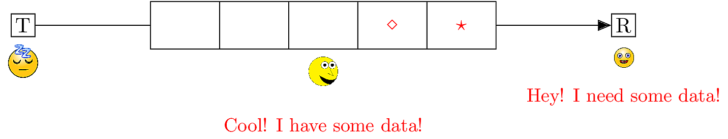 In the abstract, we consider a transmitter T and a receiver R. When T has some data, it should send it to R, but first it needs to make sure that R is ready. On the other side, when R is ready to receive data, it needs to verify that T actually has some data available.